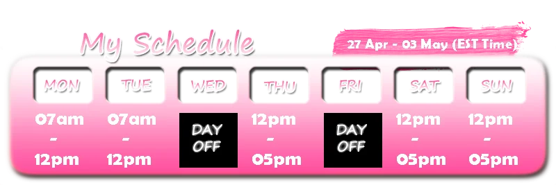 كلام بذئ, رقص مثير, تعري, فتيشية القدم, قضيب صناعي أو هزاز, خلفي, تصبيع, اختراق مزدوج, وضعية الكلب, جلوس على الوجه, تعليمات الاستمناء, العادة السرية, نشوة, ألعاب جنسية, توسُّل, رقص التعري, رقص التويرك, صدر عارٍ, نيك الصدر, صفع